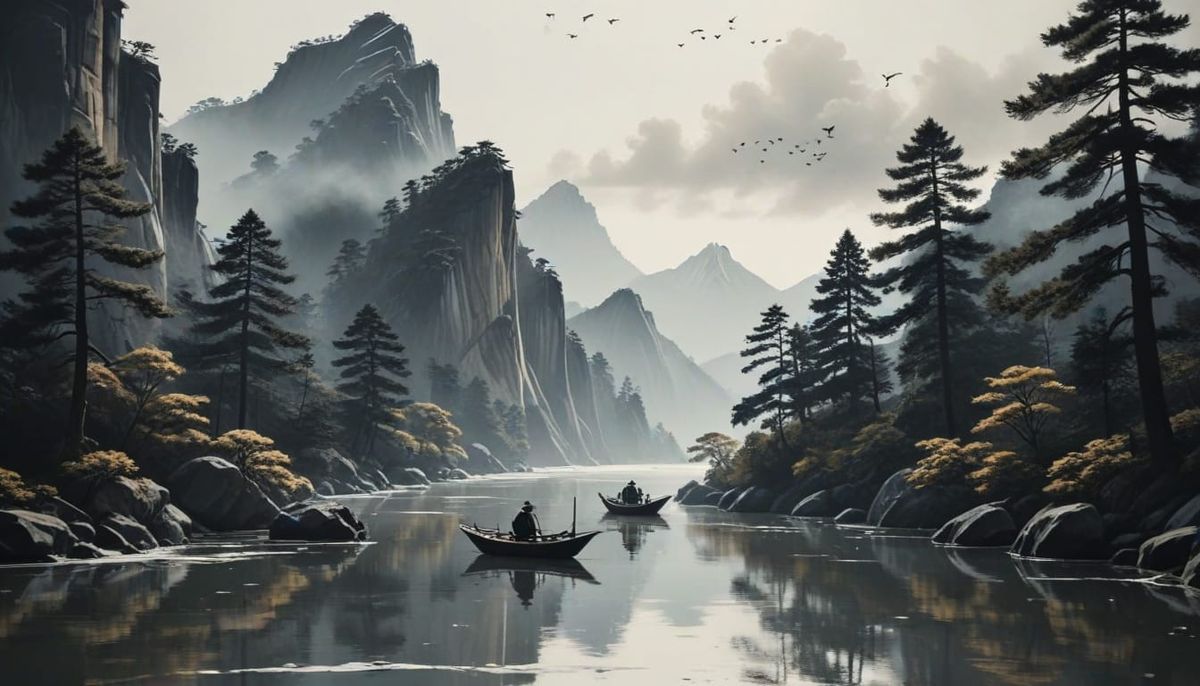 This image shows traditional Japanese sumi-e paintings of mountains, rivers, trees and boats. The monochromatic color scheme and dramatic backlight create a serene and elegant feel in this 8K resolution digital art.