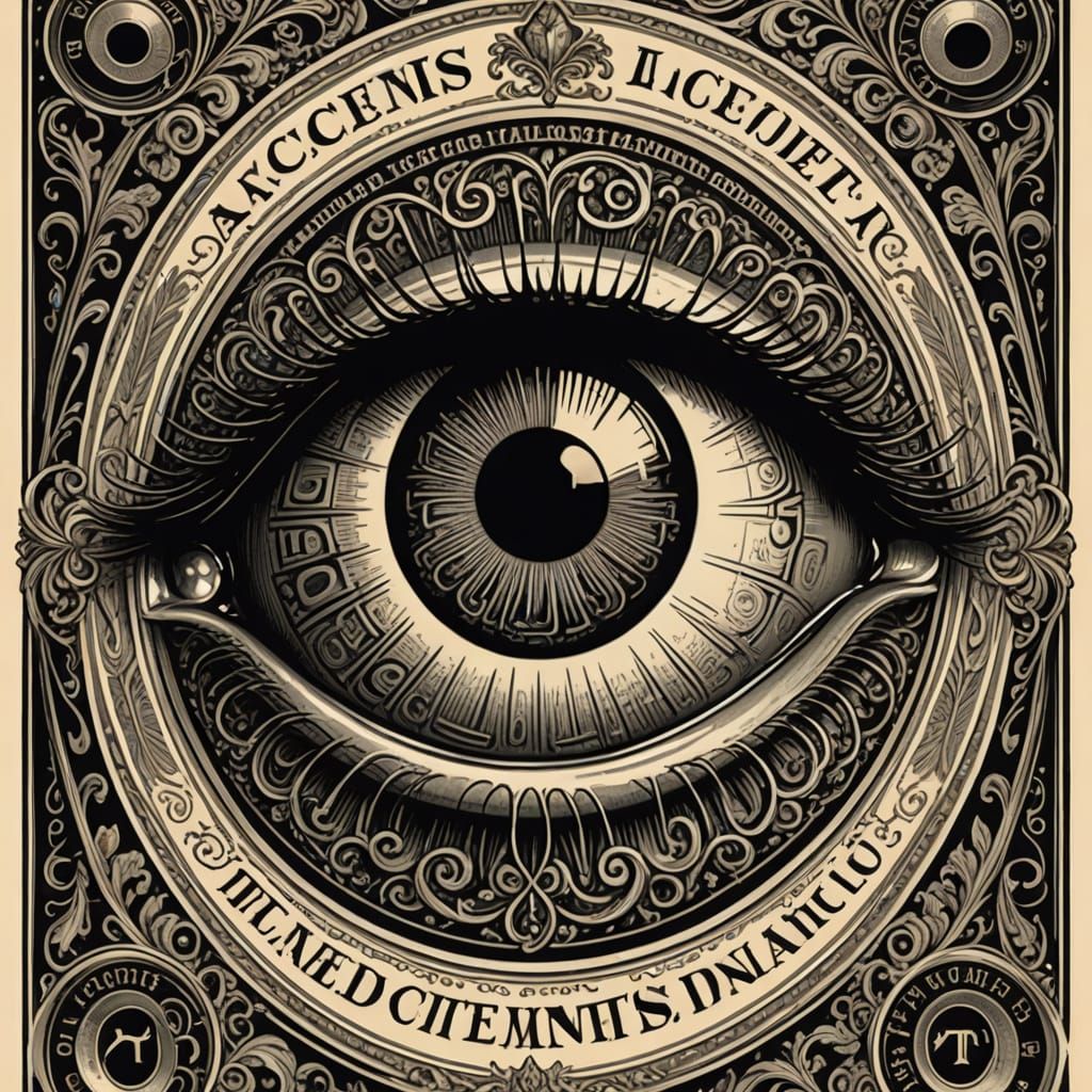 A detailed, nostalgic beer bottle label features a close-up of a single, hypnotic eye surrounded by intricate, swirling patterns and ornate typography, reminiscent of 19th century engraving techniques.