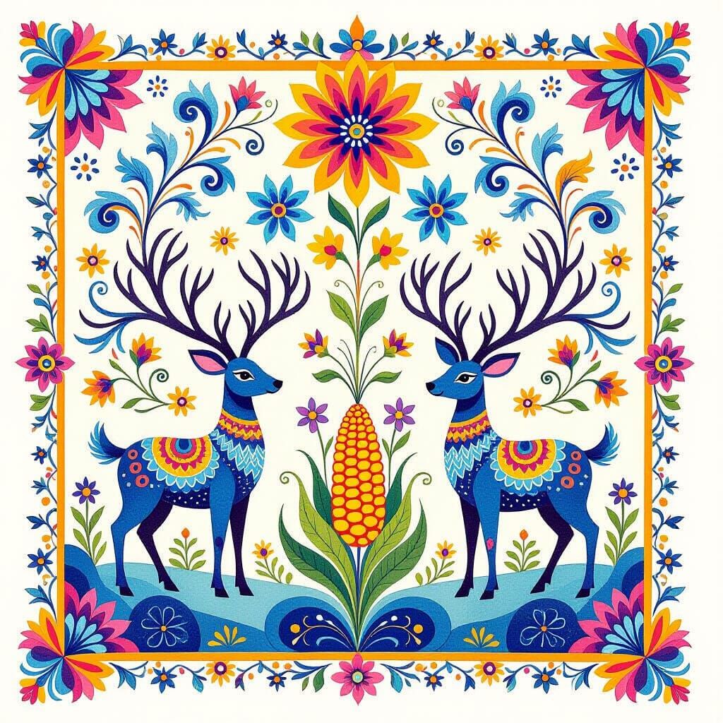 A vibrant watercolor painting showcasing a traditional Huichol (Wixáritari) art motif featuring sacred deer, peyote flowers, and geometric patterns in brilliant blues, magentas, and golden yellows. The central design incorporates the iconic yarn painting aesthetic with intricate spiral patterns, stylized ...