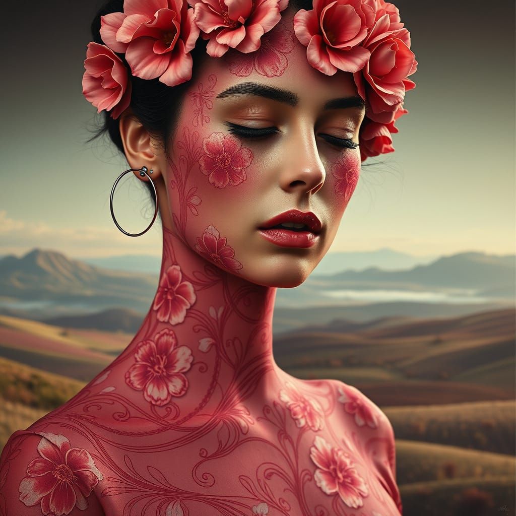 This oil on canvas painting captures a woman with intricate floral and cashmere patterns covering her face and body, rendered with chiaroscuro lighting. Features a distant landscape inspired by Caspar David Friedrich.