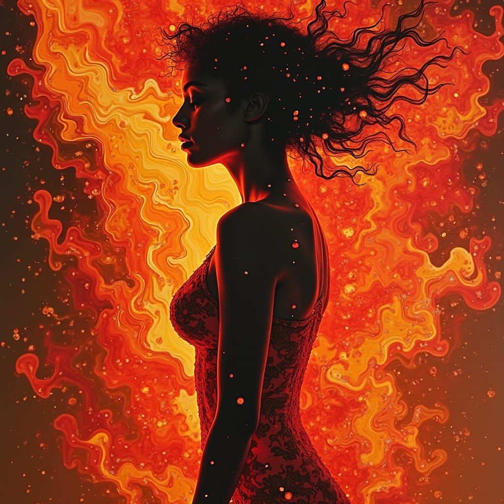 A striking picture of a woman engulfed in flames with an abstract, fluid form. The artwork features geometric patterns, bold colors, mirrored reflections and high contrast linework in a style reminiscent of Op Art and abstract expressionism.