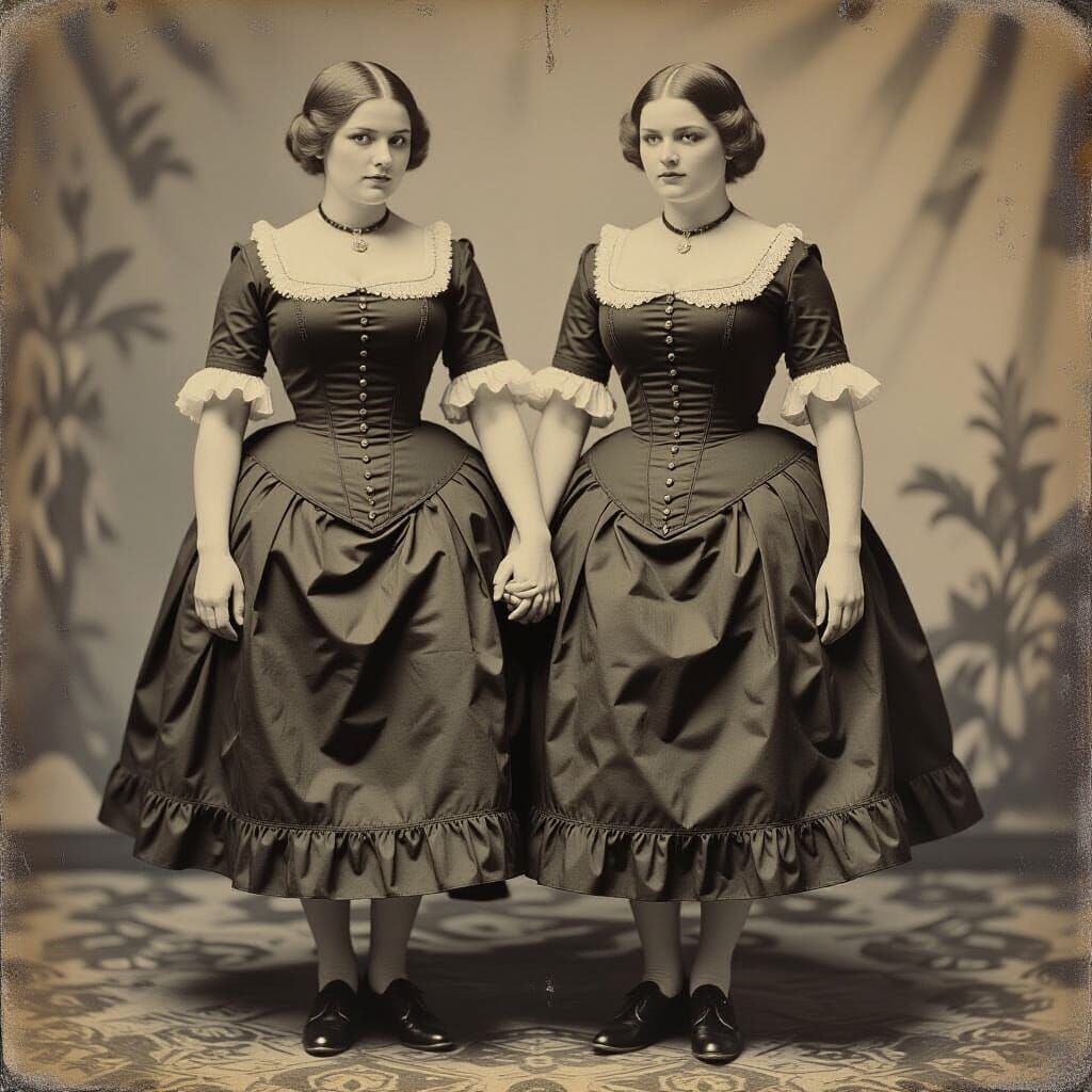 Generate your own hyper-realistic Victorian portraits. Easily create unique images of conjoined women in vintage style for free.