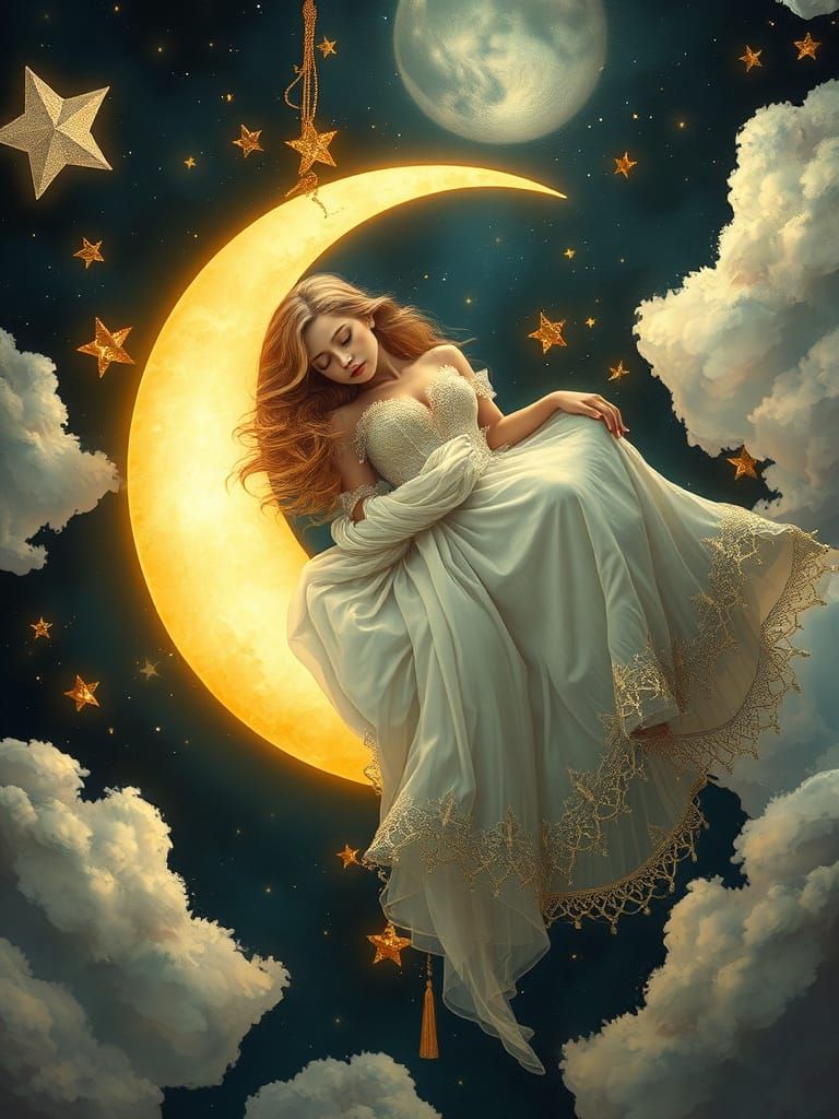 This enchanting image shows a young woman sleeping peacefully on a luminous crescent moon amidst fluffy clouds and a starry sky, surrounded by intricate lace and beaded details, evoking a sense of mystical fantasy and dreamlike reverie.