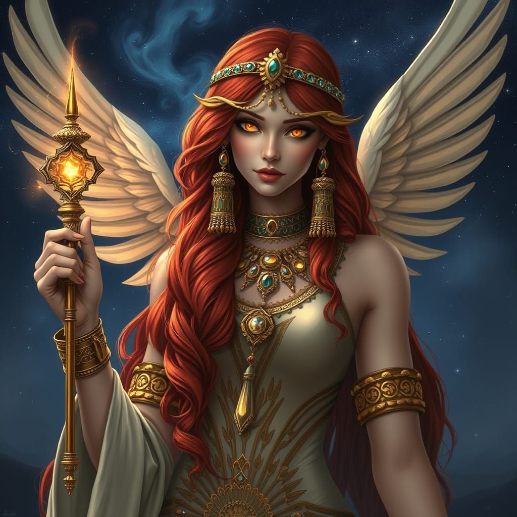This image depicts a mystical Egyptian woman with long, red hair and ornate gold accessories. She has glowing orange eyes and angelic wings, holding a magical wand amidst a starry night sky with ethereal swirls of light.