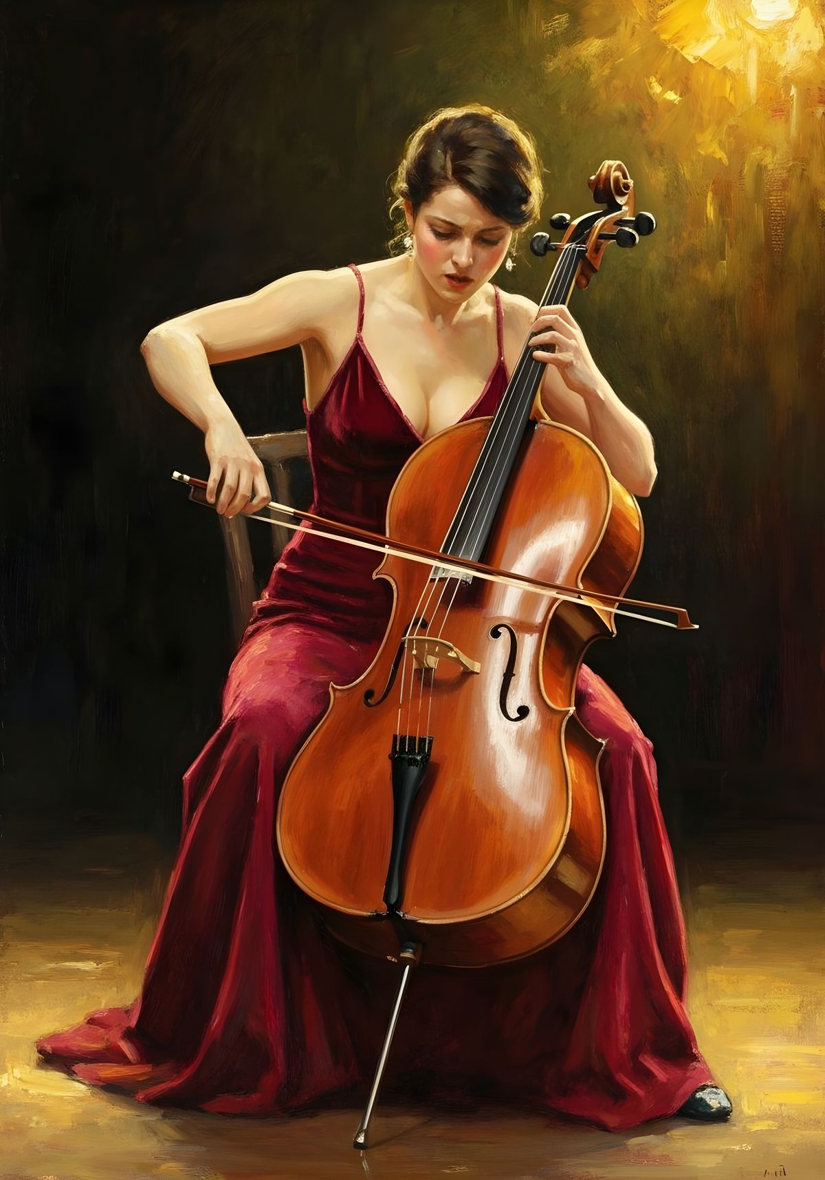 This image depicts a woman in a velvet dress playing the cello on stage, rendered with loose brushstrokes and warm golden colors, evoking dynamic movement in an impressionistic art style.