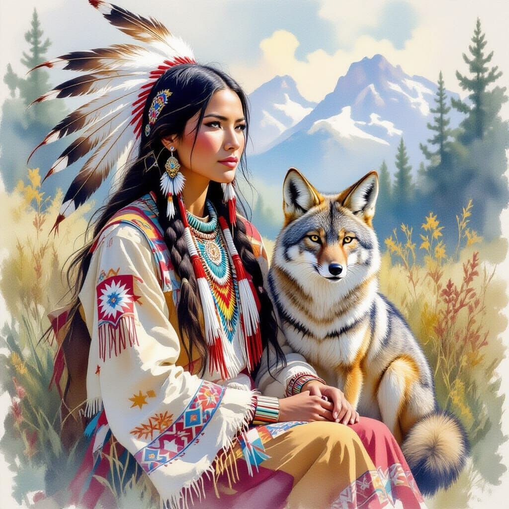 This image shows a Native American woman in traditional clothing with a coyote in a peaceful natural setting. The artwork is reminiscent of realistic watercolor paintings.