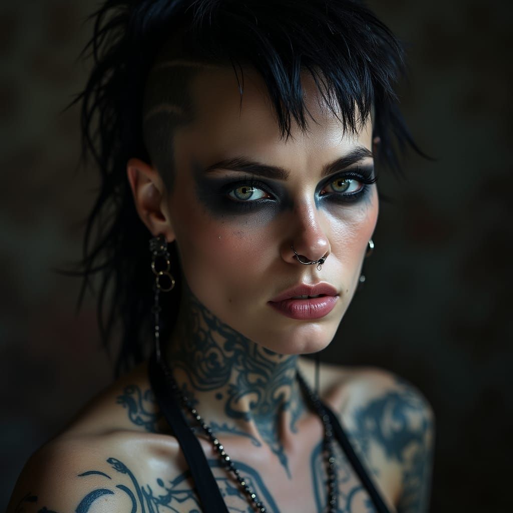 This portrait features a striking female figure with a bold, edgy look, set against a backdrop of dramatic lighting and deep shadows. Inspired by the masterful techniques of Rembrandt and other renowned artists, this image showcases intricate details and textures in a hyper-realistic style.