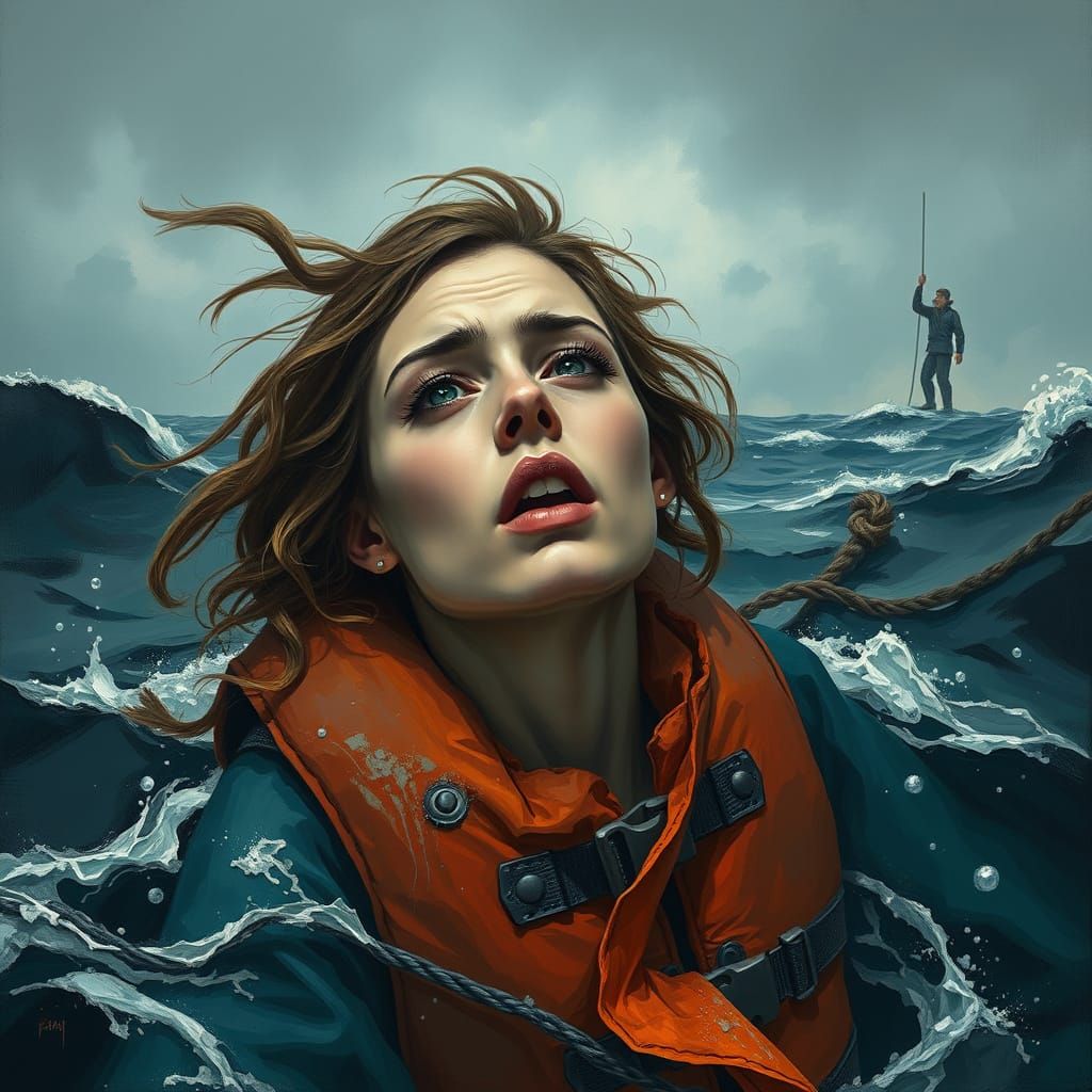 A woman in emotional distress, wearing a tattered life jacket, clings to hope as a distant figure throws a lifeline in a stormy sea, amidst bold brushstrokes and vibrant colors