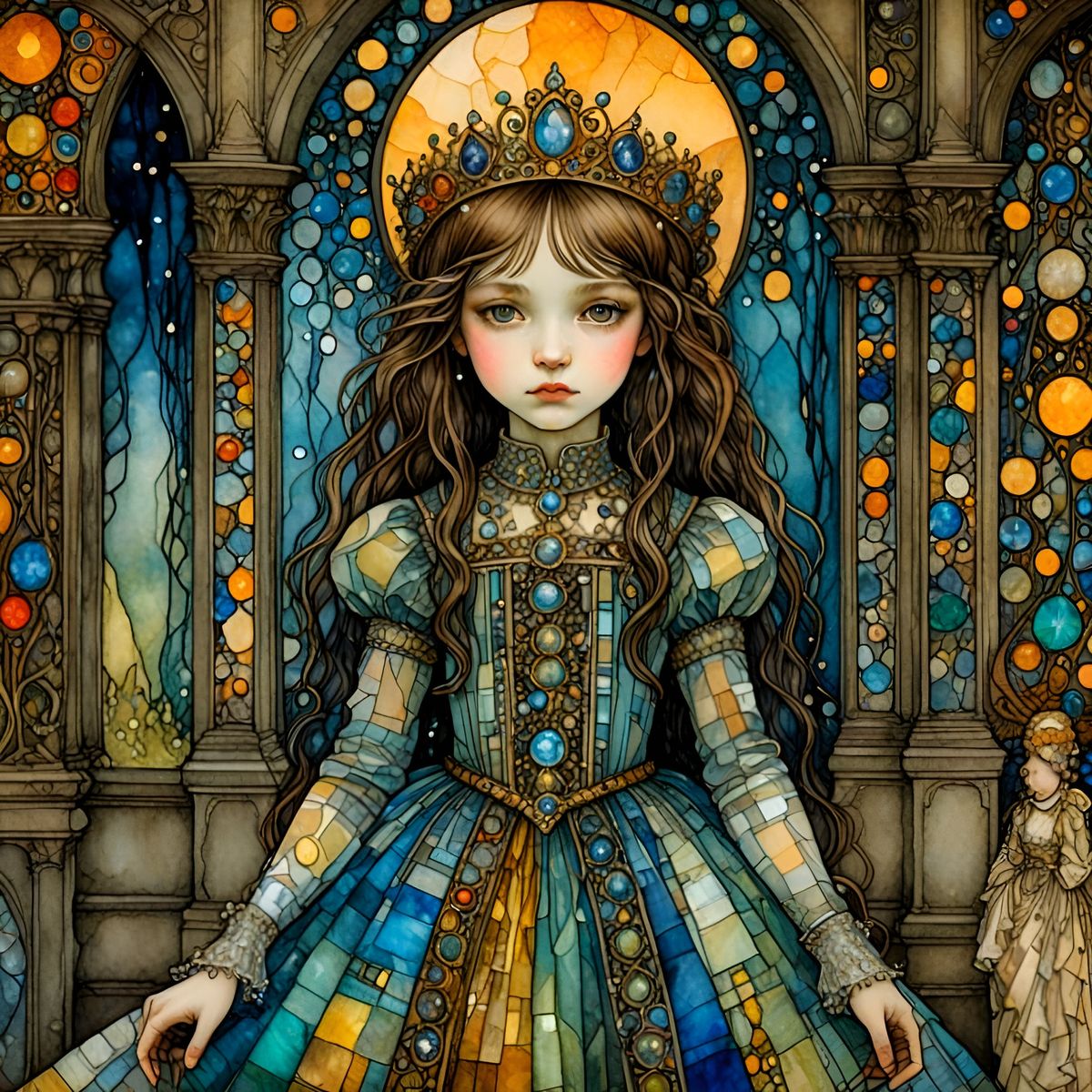 This image depicts a detailed princess adorned in crystal within her palace, rendered in a style reminiscent of Art Nouveau masters with watercolor and ink techniques.