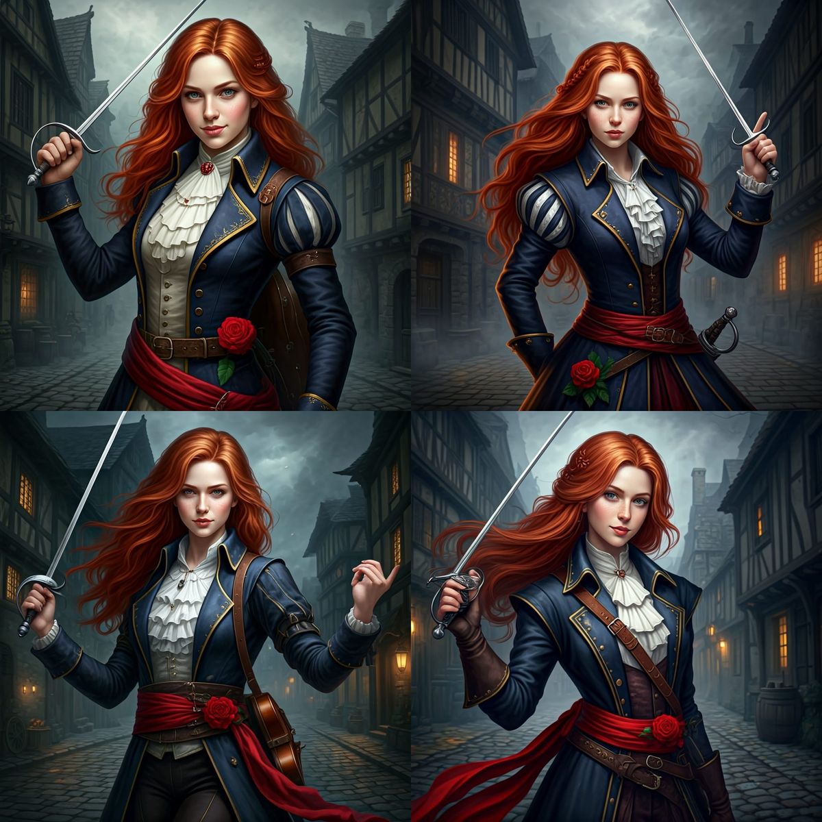 A striking portrait of a confident young duelist in a dark fantasy setting. The red-haired beauty wields a rapier, hinting at both noble and bardic talents in a medieval world.