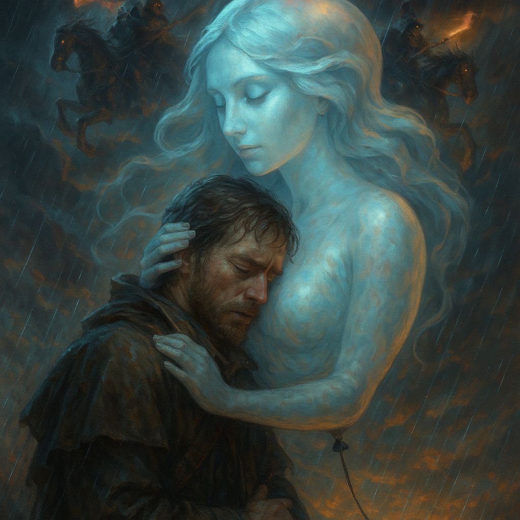 A weary traveler finds shelter with a spectral balloon woman during a storm. Ghost riders appear in the sky. This image features hyperrealistic details and a dramatic, colorful scene.