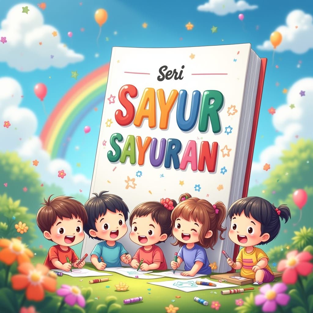 This image showcases a lively children's coloring book cover in the Donghua anime style, featuring a standing book surrounded by happy preschool kids coloring with crayons and markers in a bright, sunny scene with vibrant colors and festive atmosphere.