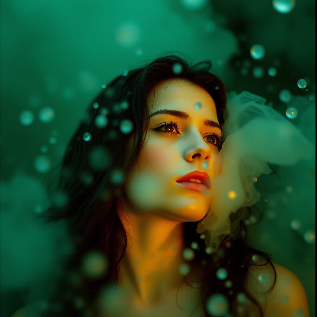 This image shows young women inside transparent soap bubbles. The cinematic photo features film grain and dramatic, atmospheric lighting, reminiscent of live-action film.