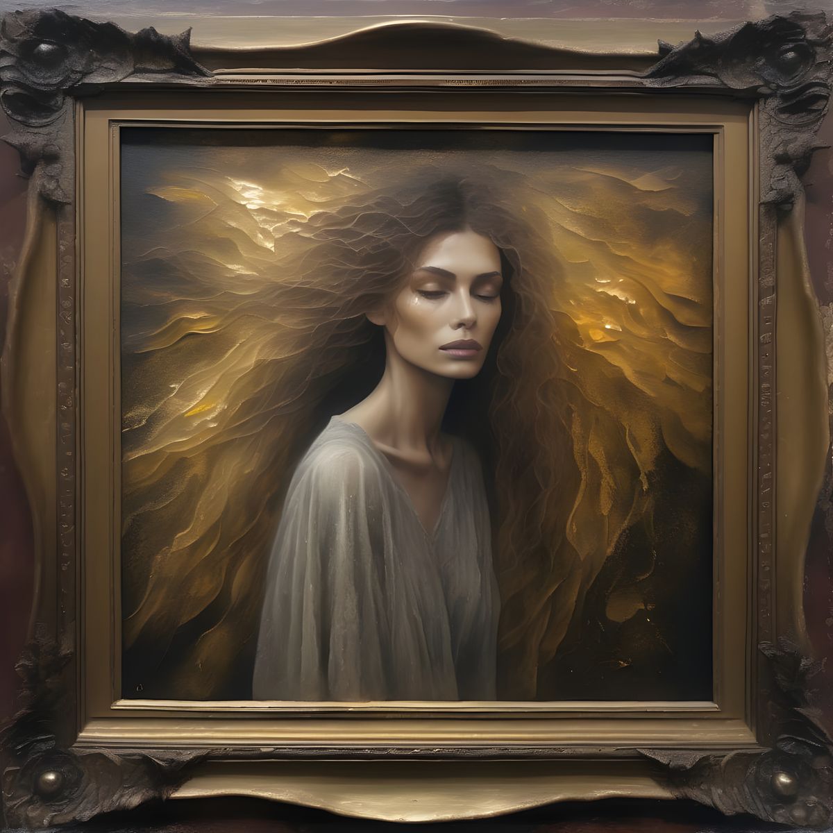 Solace reflects the quiet refuge found within the self when the outer world becomes too loud. The woman's closed eyes and tranquil demeanor suggest a withdrawal not of escape, but of restoration—a return to the inner sanctuary where thought, emotion, and spirit converge. Philosophically, this evokes the Stoic idea that peace is not granted by circumstance but cultivated through inner mastery. In the swirling interplay of light and shadow around her, we glimpse the paradox of existence: that serenity often arises from embracing complexity, and that true comfort is born not from avoidance, but from acceptance.
