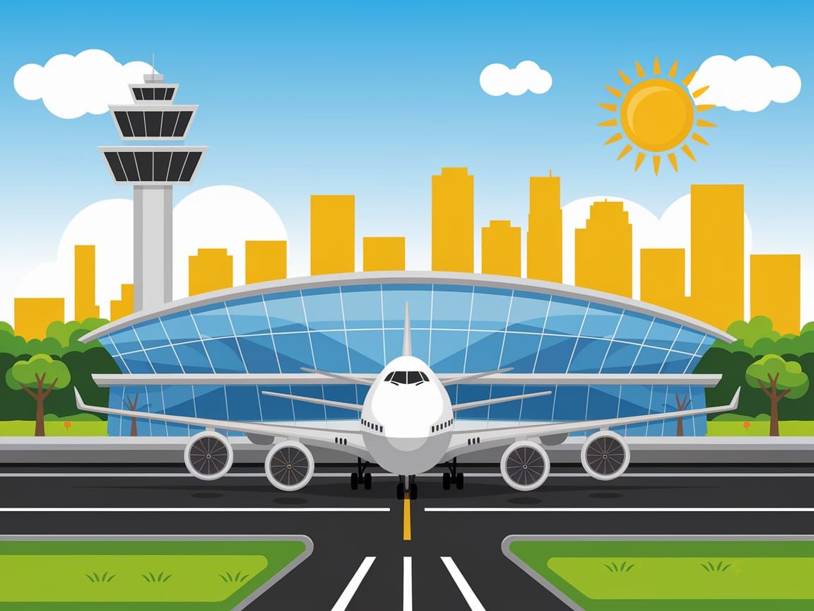 This image shows a colorful cartoon airport scene with a sleek 747 airplane, a blue-glass terminal, and a bright city skyline under a sunny sky.