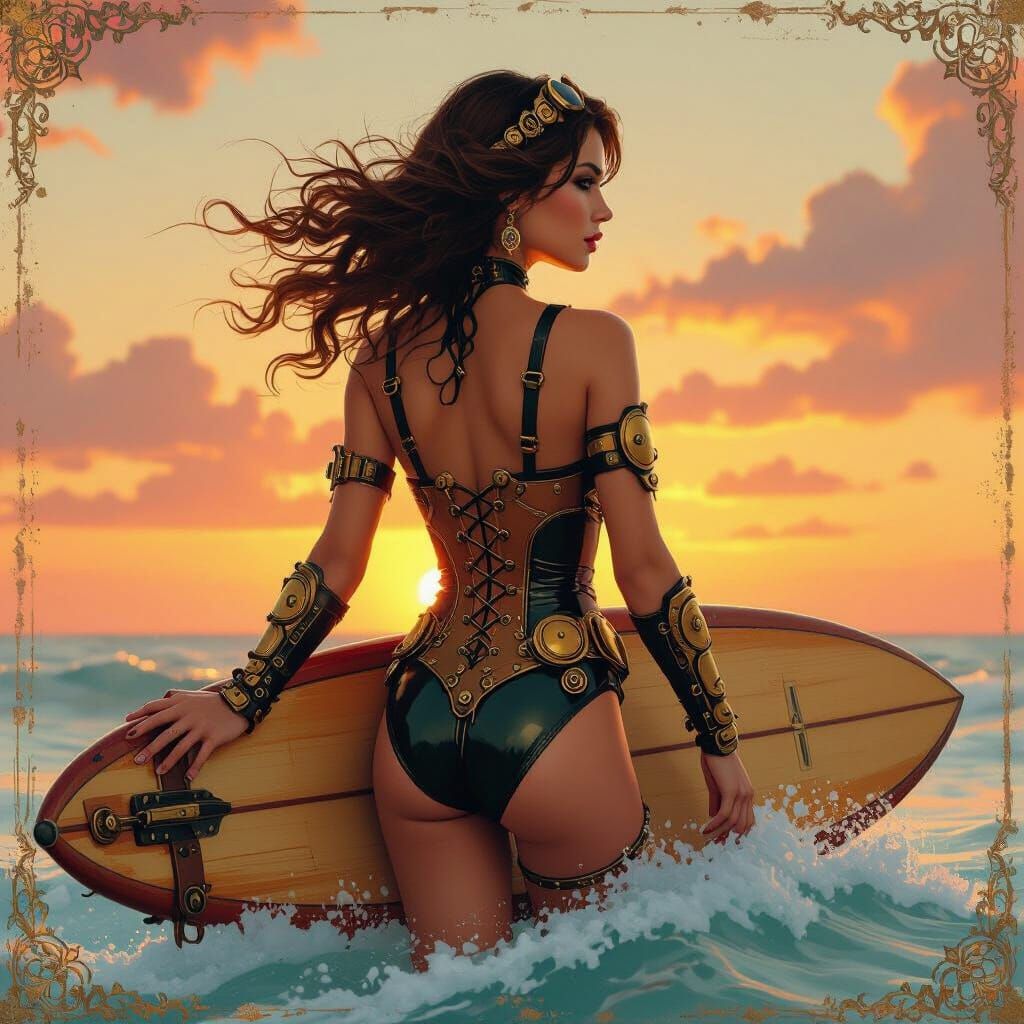 A striking picture of a woman surfing at sunset. She's wearing a steampunk-style swimsuit with brass and leather details. Her hair blows in the wind in this image with industrial and nostalgic elements.