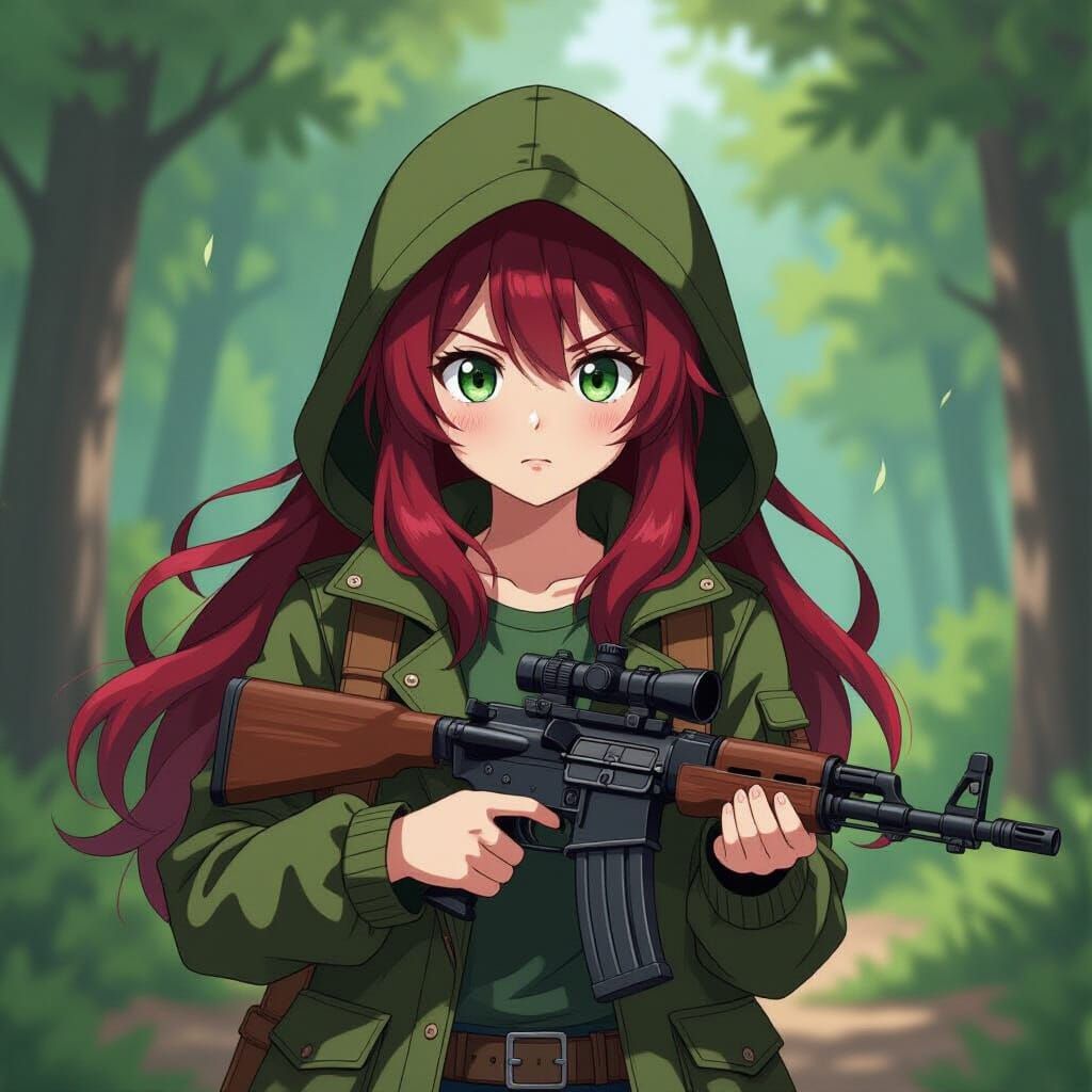 A striking picture of an anime woman with crimson hair and green eyes in a forest. The character is drawn in a vibrant, cel-shaded style with cinematic lighting.