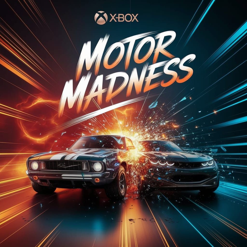 This image shows a high-energy vehicle collision depicted in warm colors. Twisted metal and shattered glass are set against a swirling nebula, conveying otherworldly power in a video game cover aesthetic.