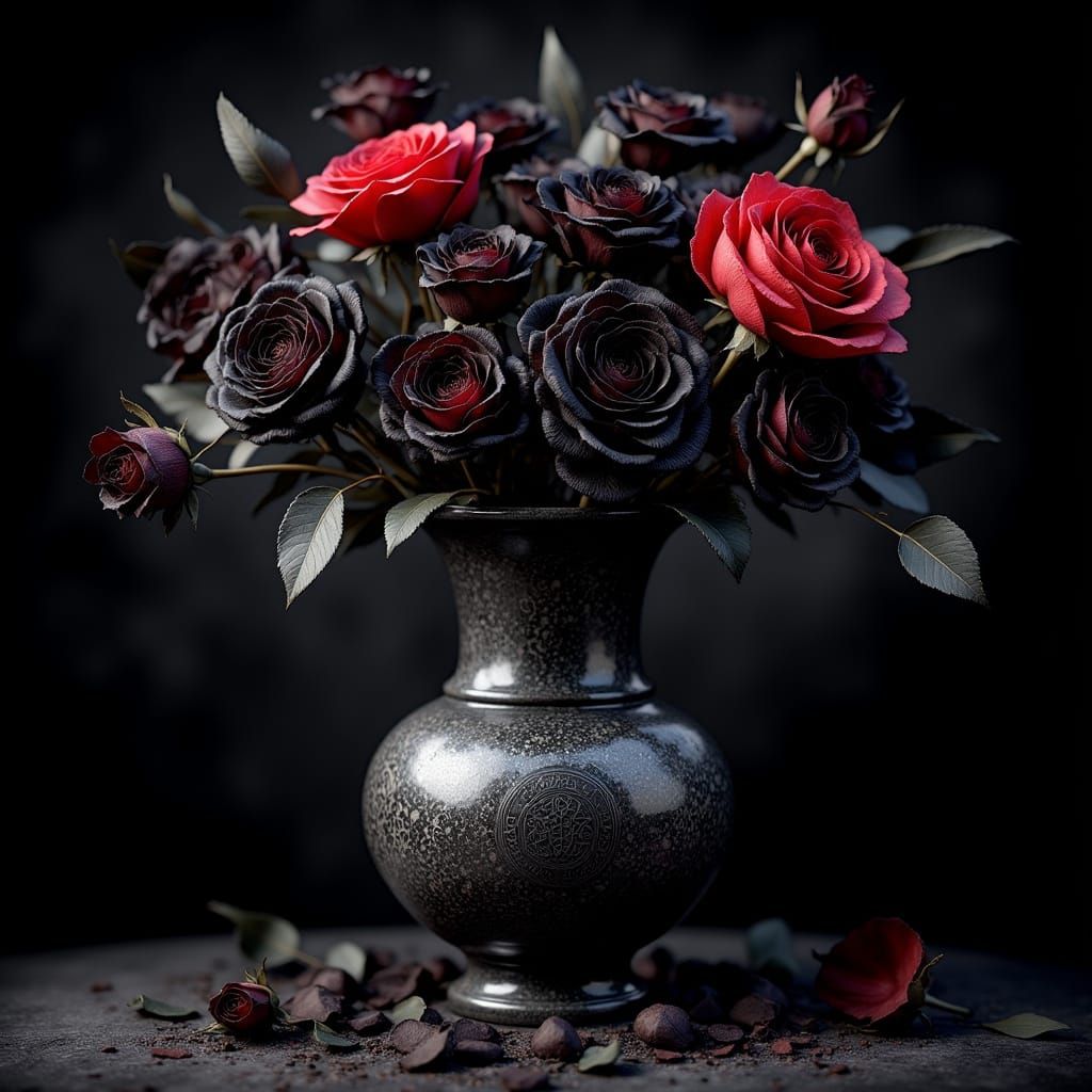 A detailed concept art portrait of a shiny vase filled with withered black roses and one bright red rose bud, illuminated by a single light ray. Features intricate patterns and a dark background.