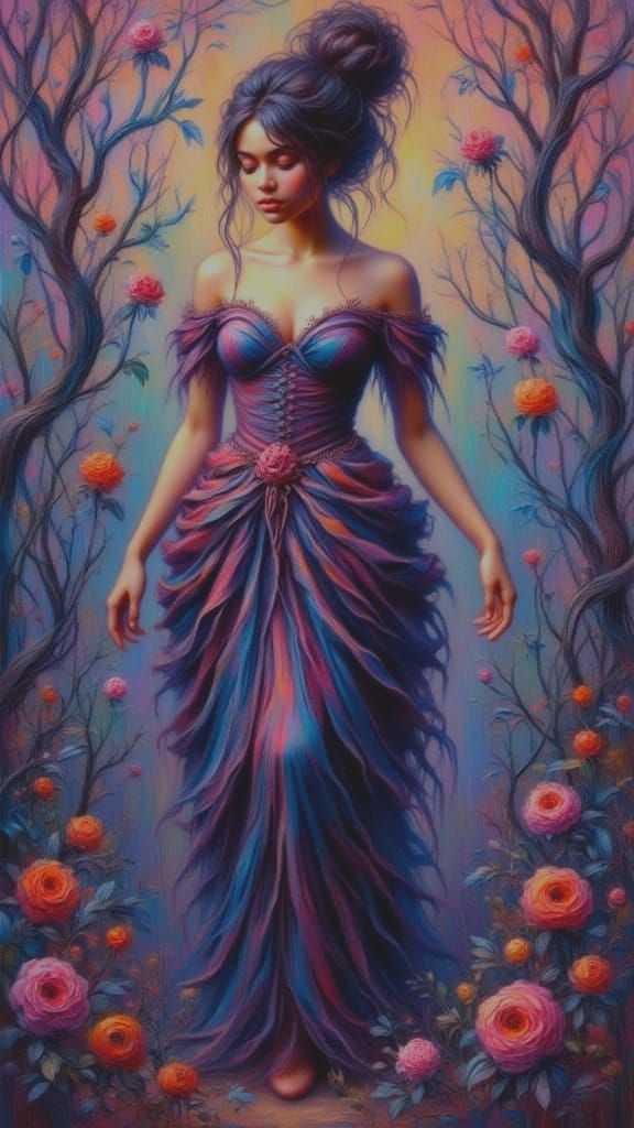 This image shows a full-length body portrait of a woman, created using glitch photography and fractal mathematics. The artwork features dynamic lighting, intricate details, and triadic colors in a hyperdetailed digital art style.