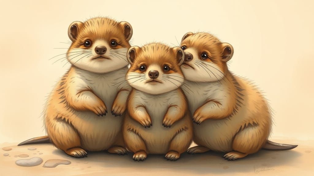 This charming illustration features cute and adorable hyraxes, also known as dassies. The artwork evokes a gentle, whimsical atmosphere with soft, earthy colors and warm lighting, reminiscent of classic children's book illustrations.
