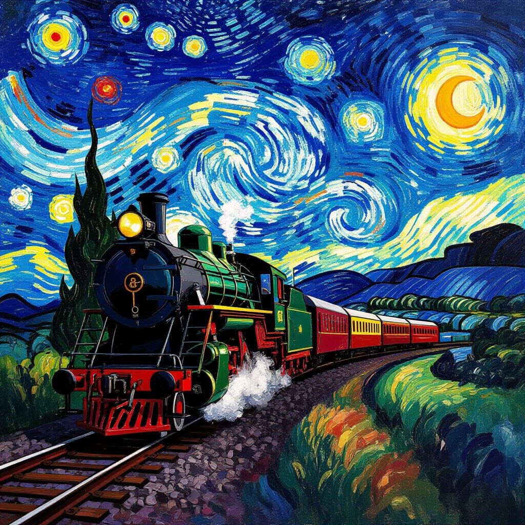A majestic train travels through a vibrant galaxy filled with vivid colors. The artwork is presented with an impressionistic style with expressionist brushstrokes and surreal elements.