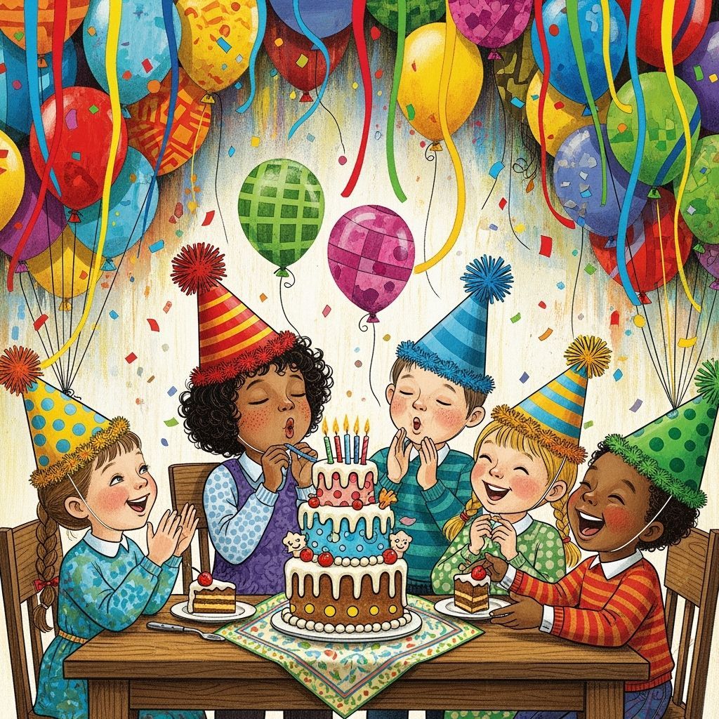 A whimsical illustration of children celebrating at a birthday party with cake, balloons, and streamers. The artwork evokes storybook charm through its vibrant colors and playful character design.