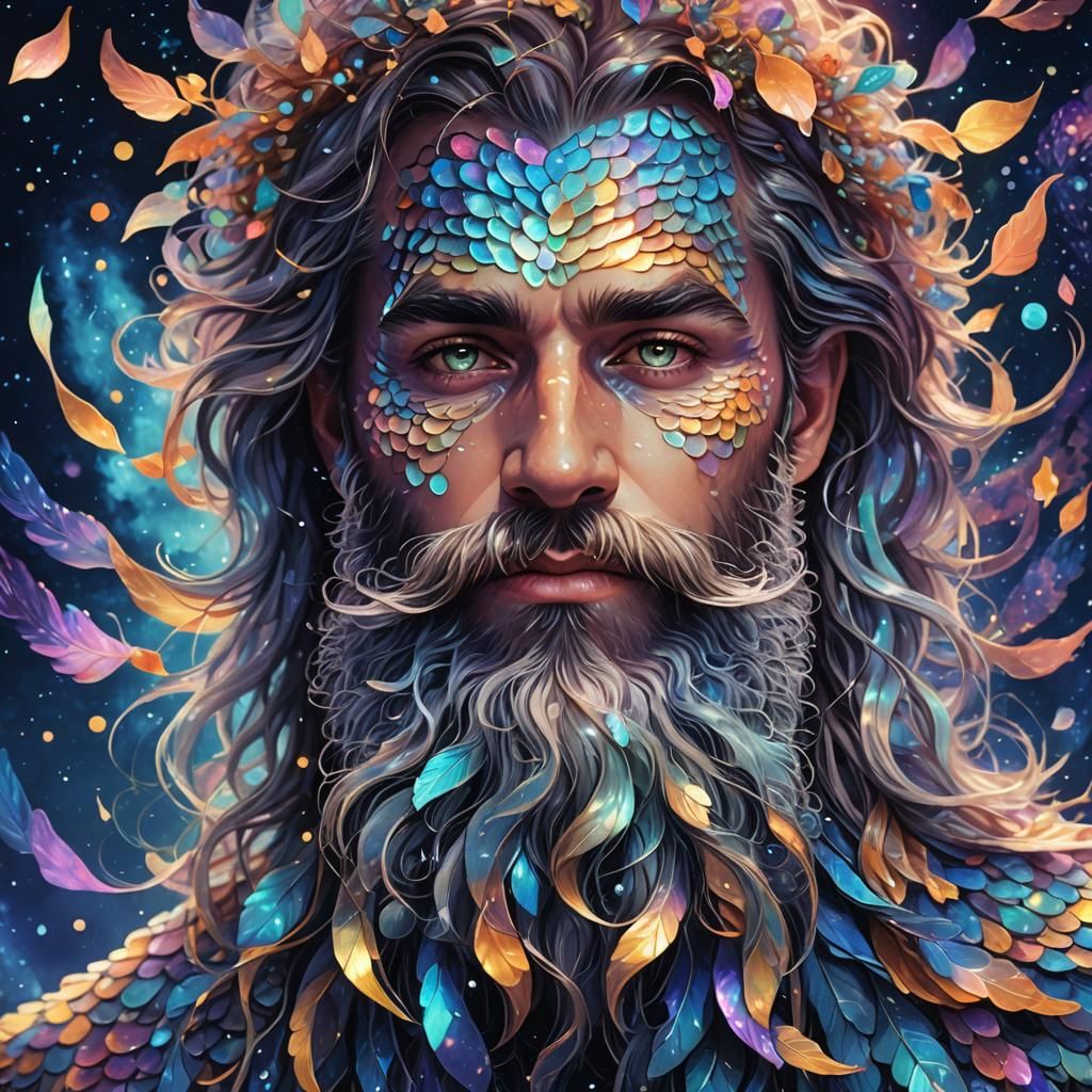 A vibrant image of a mysterious face in a starry night sky, adorned with a whimsical beard made of shimmering fish scales. The artwork has a surreal, cosmic aesthetic with glowing edges and detailed textures.