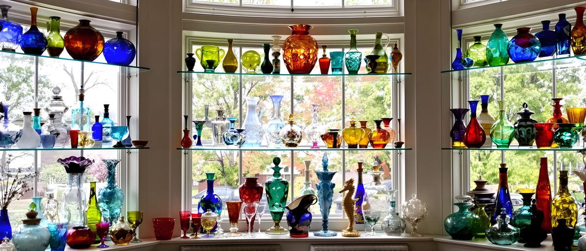 This image showcases a diverse collection of colorful glass bottles, vases, and unique shapes displayed on shelves in a bay window. Features include a seahorse, pitcher, urn, and decanter.