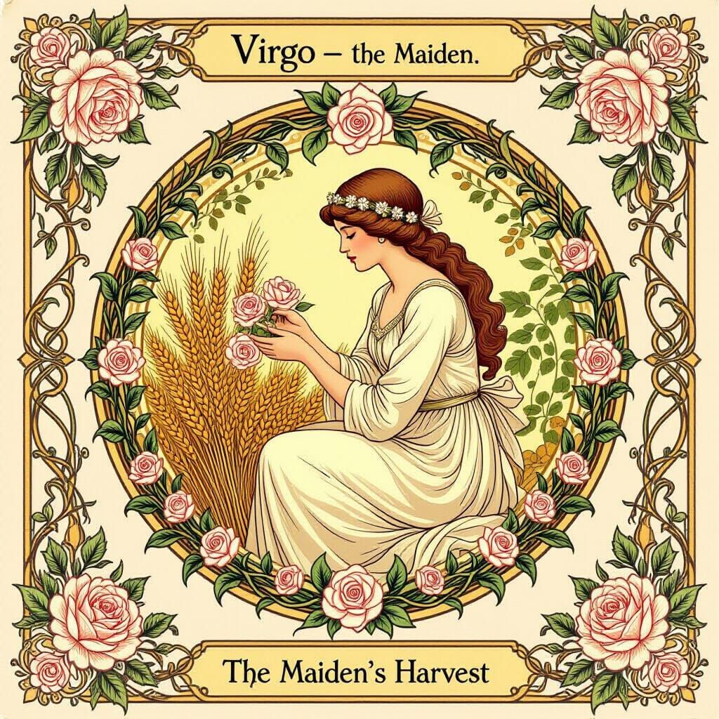 This image depicts a romantic tarot card for Virgo, featuring a maiden gathering roses and wheat. Rendered in an Art Nouveau style with intricate linework and golden highlights.