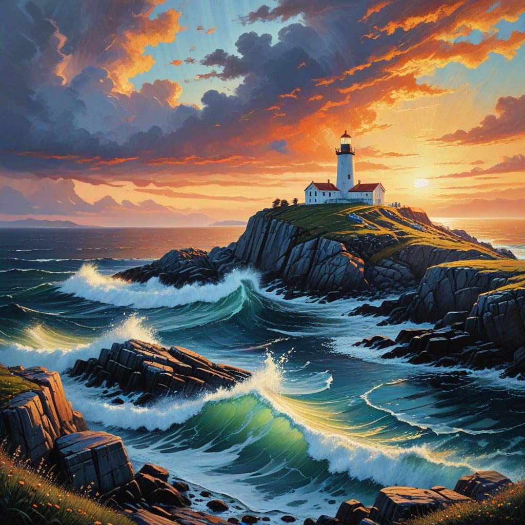 This highly detailed oil painting captures the Lindesnes Lighthouse in Norway at dawn. Textured impasto paint and vivid colors create a dramatic oceanic vista with a serene atmosphere.