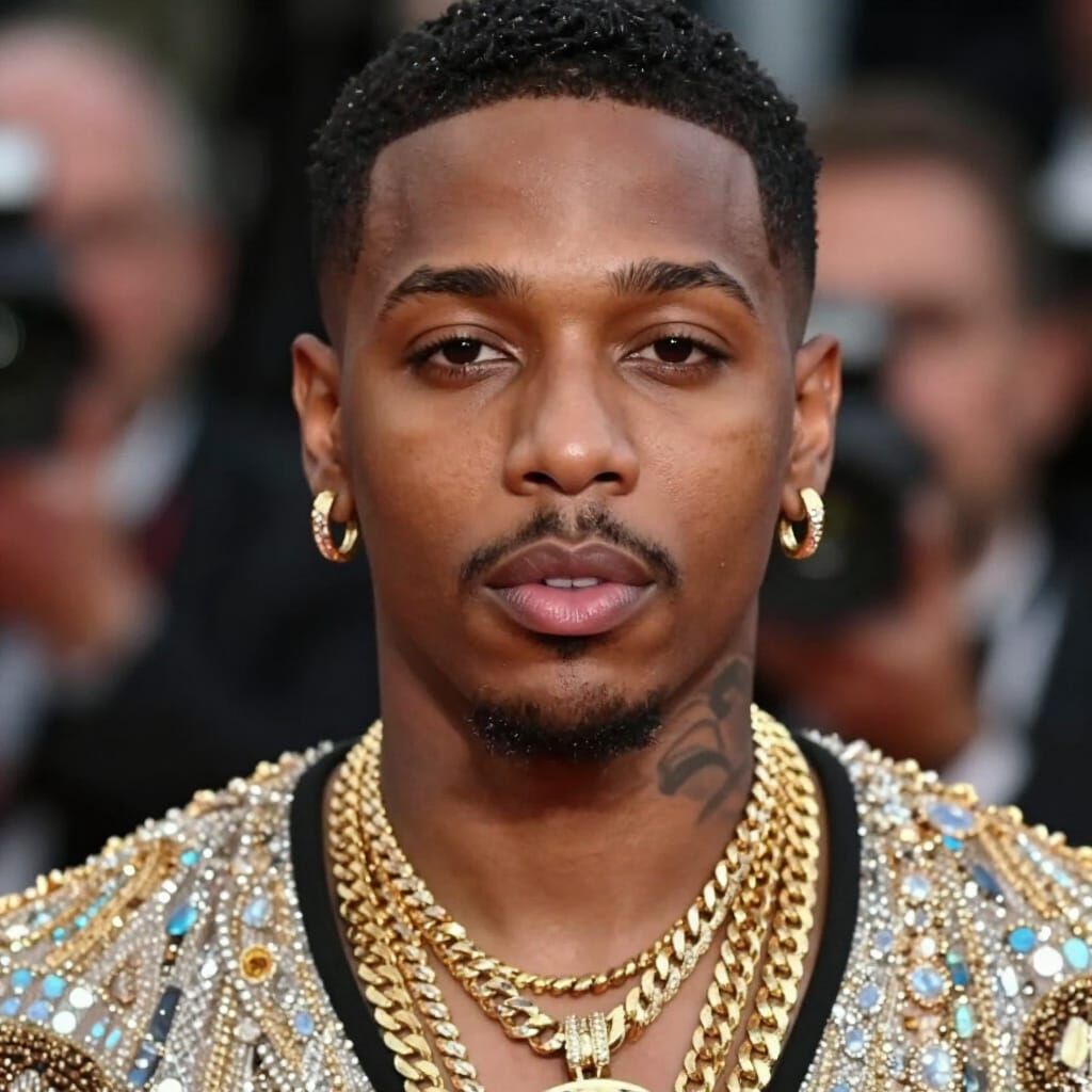 A detailed, photorealistic portrait showcasing a person in a flashy outfit, adorned with heavy gold chains and luxurious jewelry. The image features cinematic lighting and a soft bokeh effect, mimicking a candid paparazzi shot with a low-quality aesthetic.