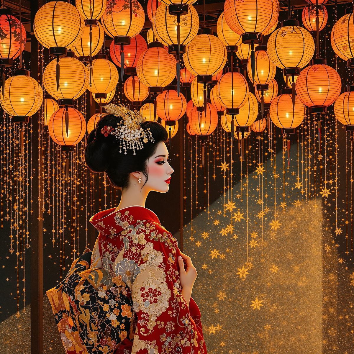 This image shows a red-clad woman in Kyoto beneath lanterns, her kimono slightly open. It blends ink and fire, rendered with incandescent refinement.