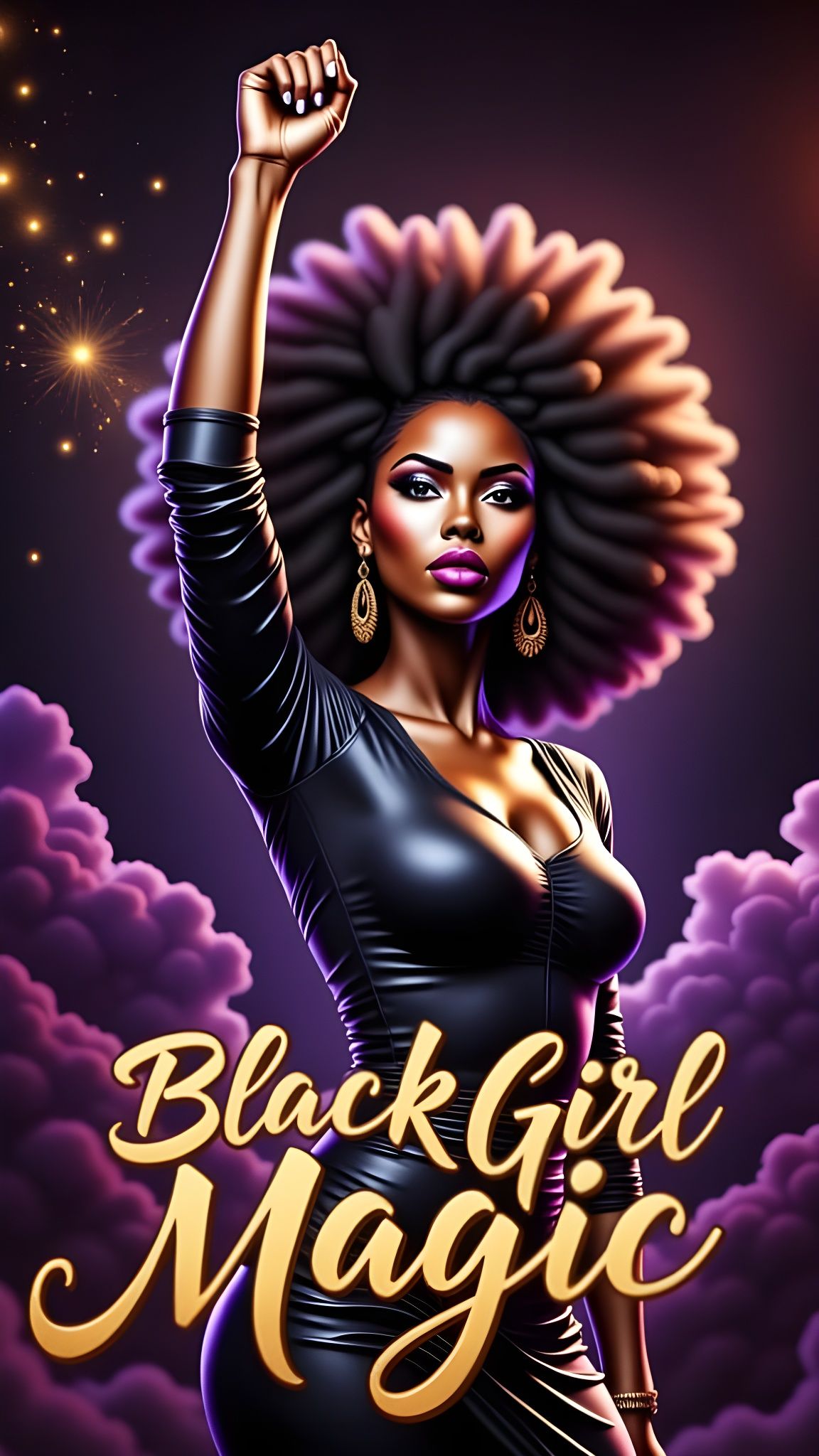 This image shows a powerful portrait of a young Black woman raising her fist, symbolizing strength. Swirling energy and golden text enhance the dramatic, detailed digital illustration.