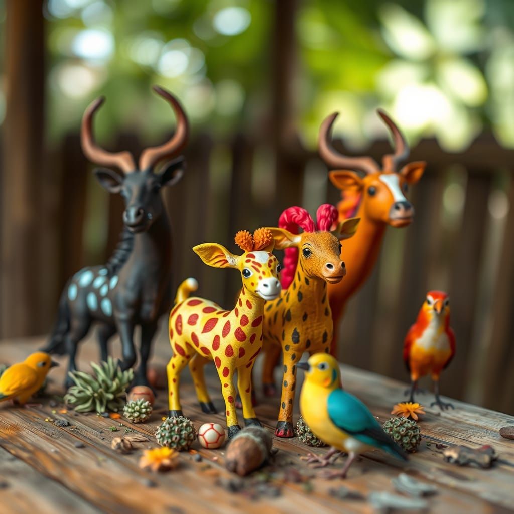 This image shows colorful felt farm animals arranged on a wooden table. Scissors, glue, and other crafting materials surround the playful scene, captured with soft bokeh.