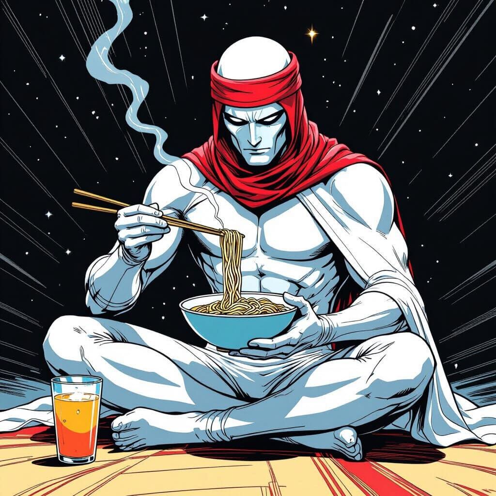 This image depicts the Silver Surfer in traditional Middle Eastern attire, enjoying a bowl of noodles and juice. Rendered in a vibrant comic art style with bold outlines and dramatic lighting, it fuses cosmic grandeur with cultural elements.