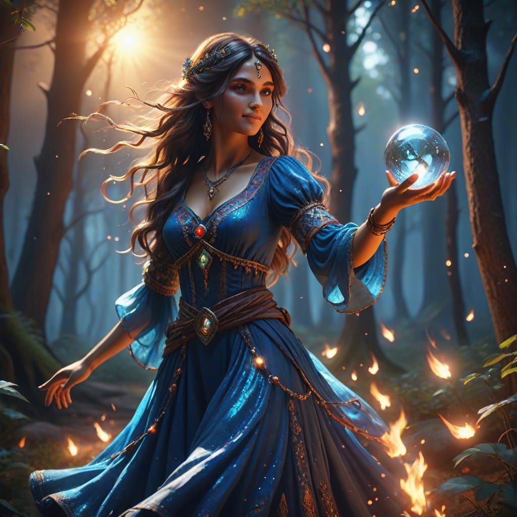 This image shows a captivating fantasy scene of a gypsy woman dancing in a mystical forest, surrounded by sparkling lights and warm, soft undertones, with intricate details and vibrant colors, reminiscent of epic 3D videogame graphics.
