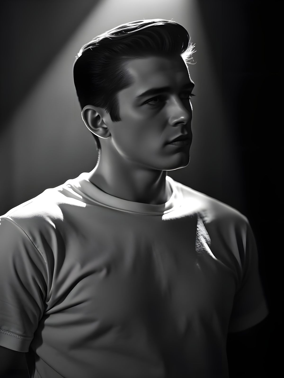 This image shows a black and white portrait of a man reminiscent of the 1950s, channeling a film noir aesthetic. The high-contrast image features dramatic lighting and a soft background blur.
