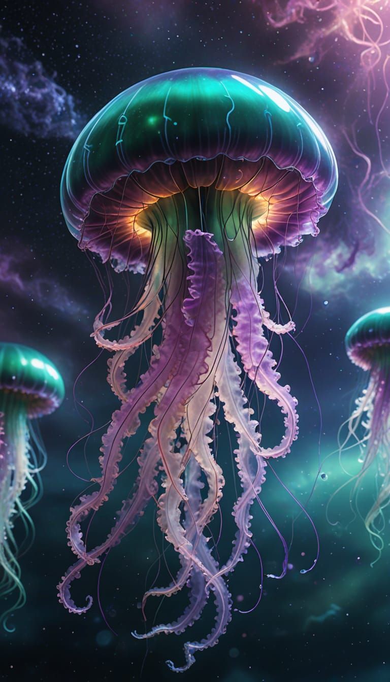 This image shows a majestic, glowing jellyfish swimming in a nebulous sea, surrounded by a shimmering iridescent bubble and vibrant, swirling clouds of purple and pink nebula gas. The jellyfish's translucent body glows with a soft, dreamy light, while its chuthulu tentacles remain sharp and defined.