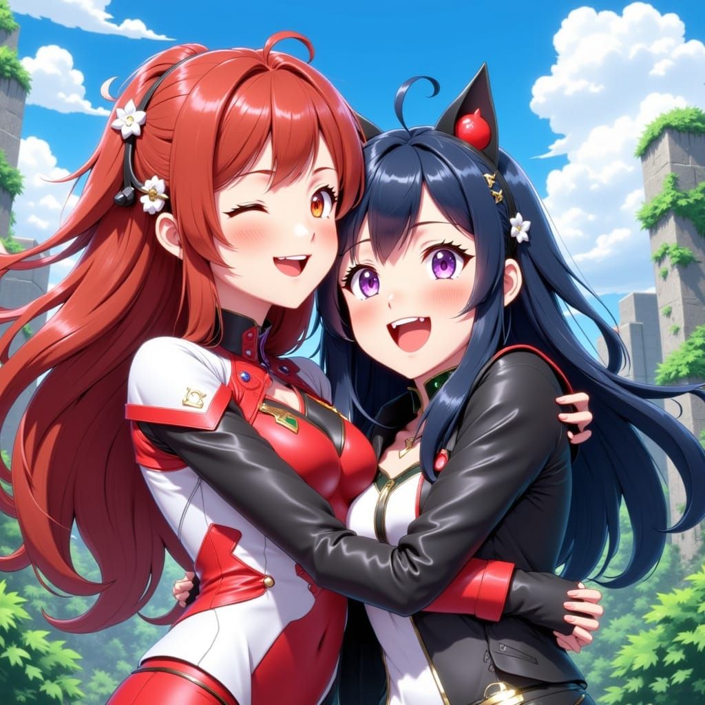 This image showcases two anime women in a heartwarming embrace. The art style is reminiscent of vibrant, cel-shaded animation with soft lighting, capturing a mood of camaraderie and happiness.