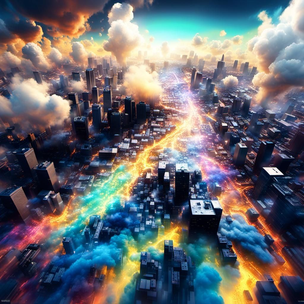A hyperrealistic image of data-driven clouds over a city. The digitally generated clouds feature intricate textures and colors, dynamically mapping ground activity in a stylised 3D rendering.
