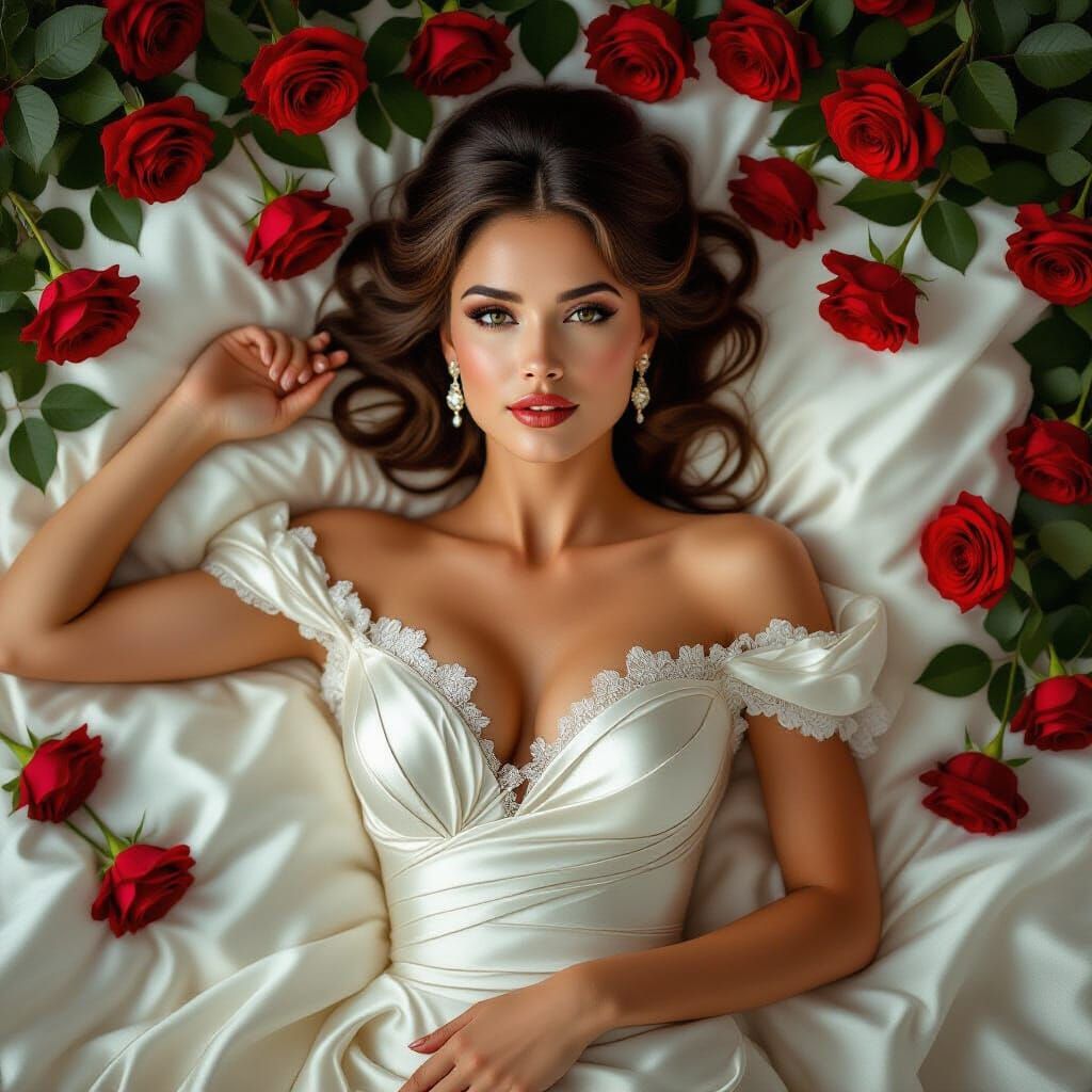 This image shows a woman in elegant attire lying on a luxurious bed covered in red roses. It is a photorealistic image with precise textures and subtle lighting, in a style reminiscent of hyperrealist art.