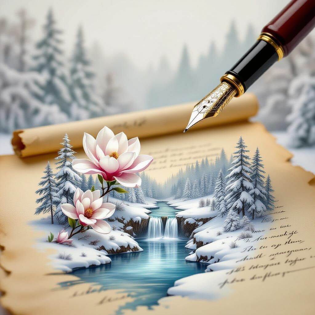 This image shows a surreal landscape where ink from an antique pen transforms into a miniature magnolia forest, with a waterfall cascading onto parchment. Rendered in an impressionistic oil painting style.