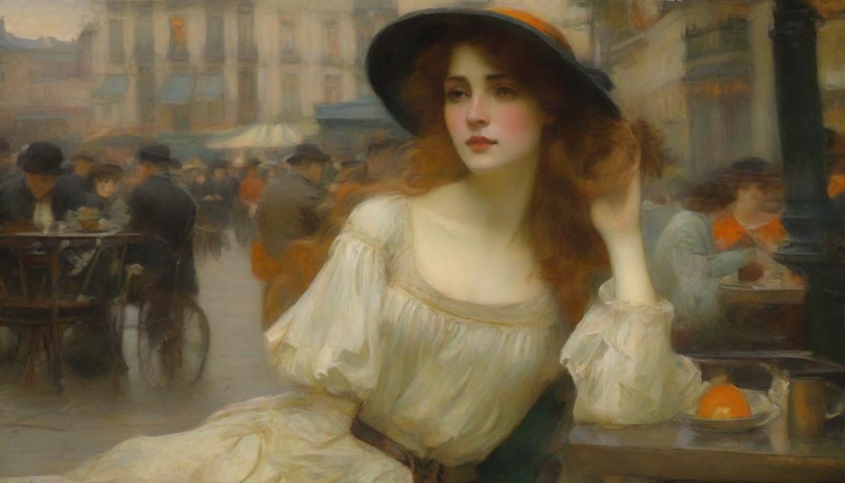 A serene image of a stylish woman at a Parisian cafe. The scene captures a moment of quiet contemplation with soft focus and harmonious colors, reminiscent of idealized naturalism.