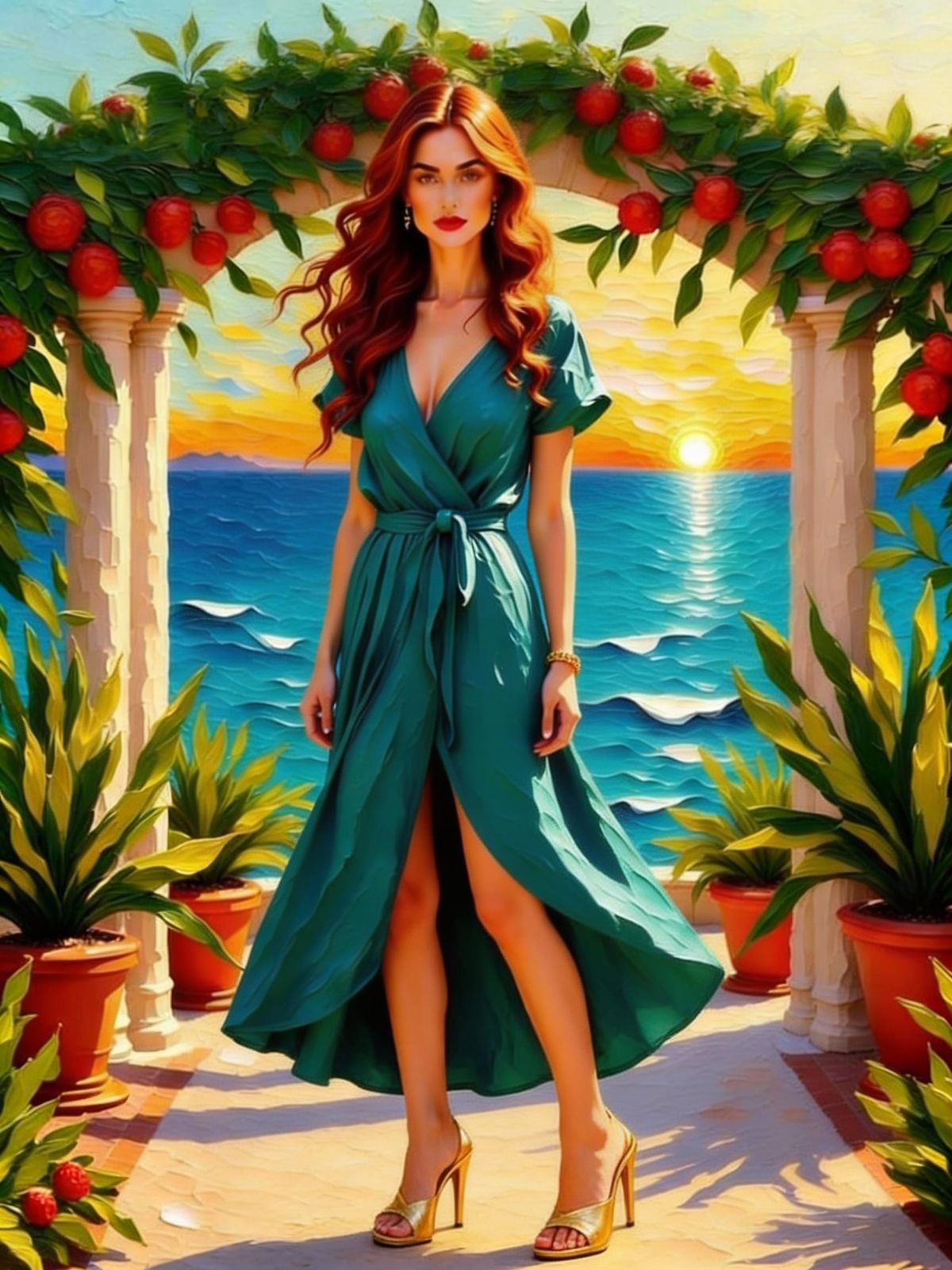This image features a beautiful French woman in a flared teal skirt and wrap blouse, standing confidently on a patio with a Mediterranean sunset view. Painted in an acrylic impasto style with jewel tones, it evokes a warm, romantic feel.