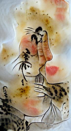 This artwork depicts a cat licking a human palm. Rendered in the style of Sumi ink and wash, it embodies the simplicity of Zenga Zen painting with watercolor ink techniques.