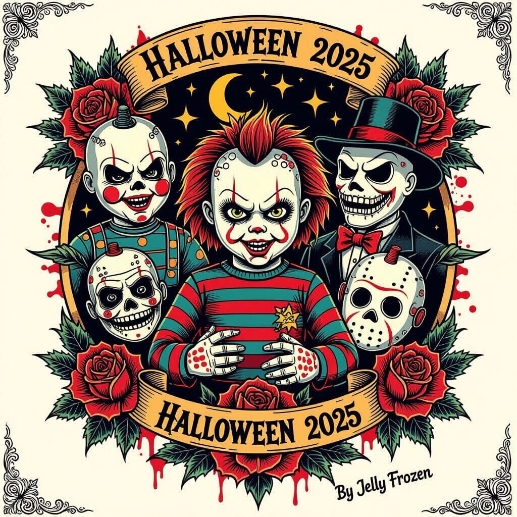 A vibrant traditional American tattoo flash sheet displaying horror movie icons. This artwork features bold colors and heavy outlines, reminiscent of classic tattoo artistry. Roses and blood splatter add to the Halloween theme.