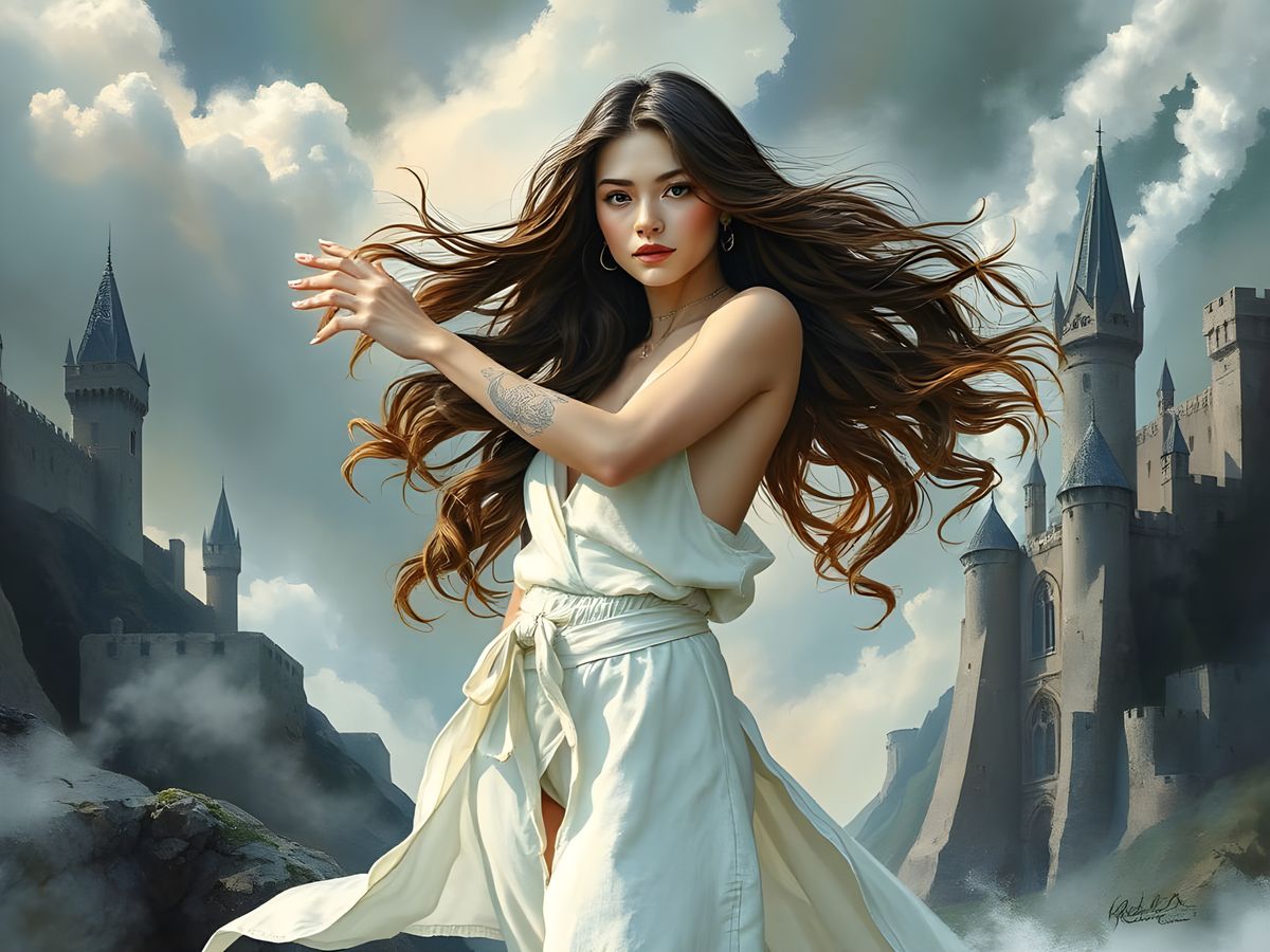 This image shows a slender sorceress with long hair, wrapped in white linen. The digital illustration, reminiscent of watercolor paintings, emphasizes detail and a dynamic composition amidst smoke and fog.
