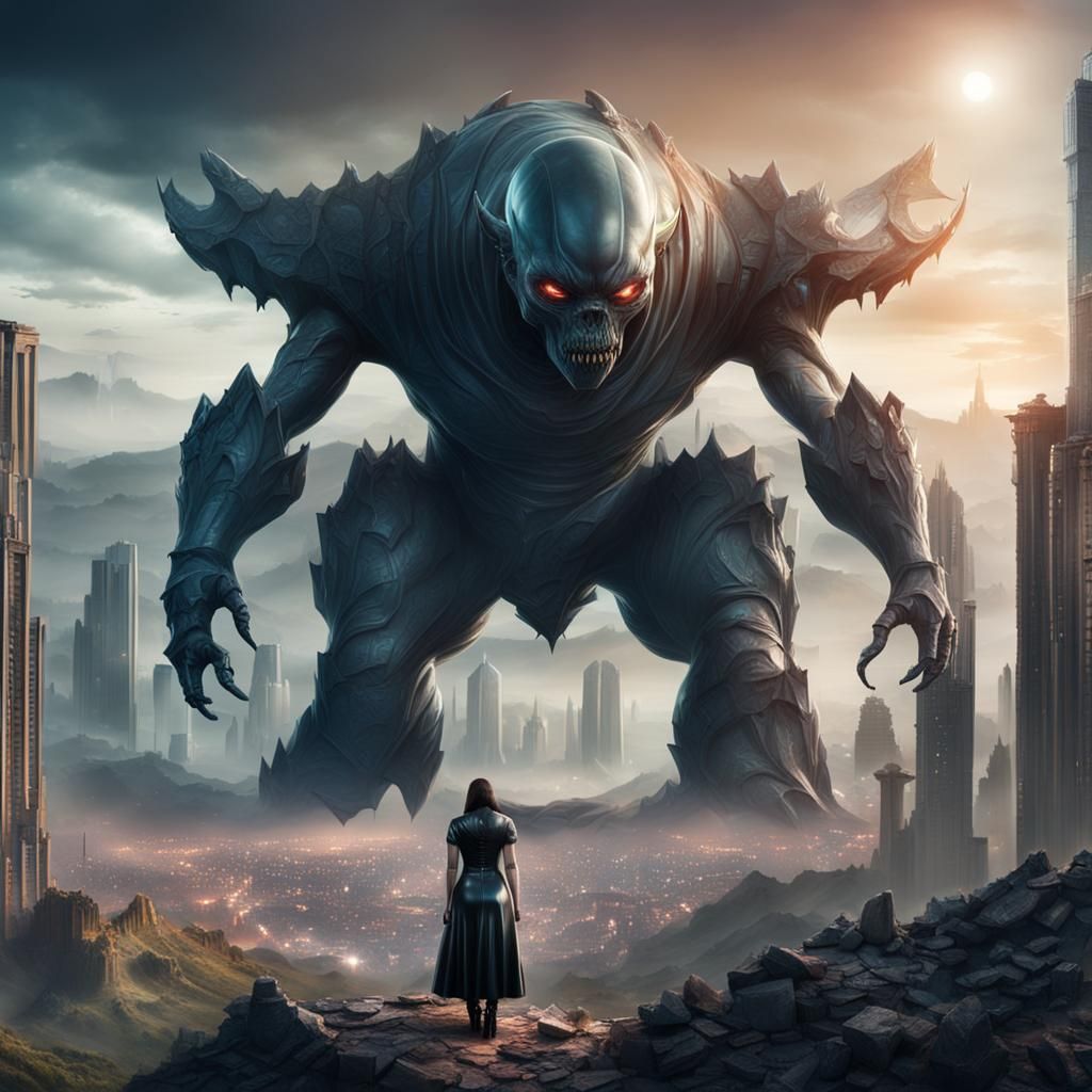 This image shows a plus-size woman in latex clothing standing on a mountain. She overlooks a dystopian alien landscape with ruined skyscrapers in a gothic aesthetic. It is a digital matte painting.