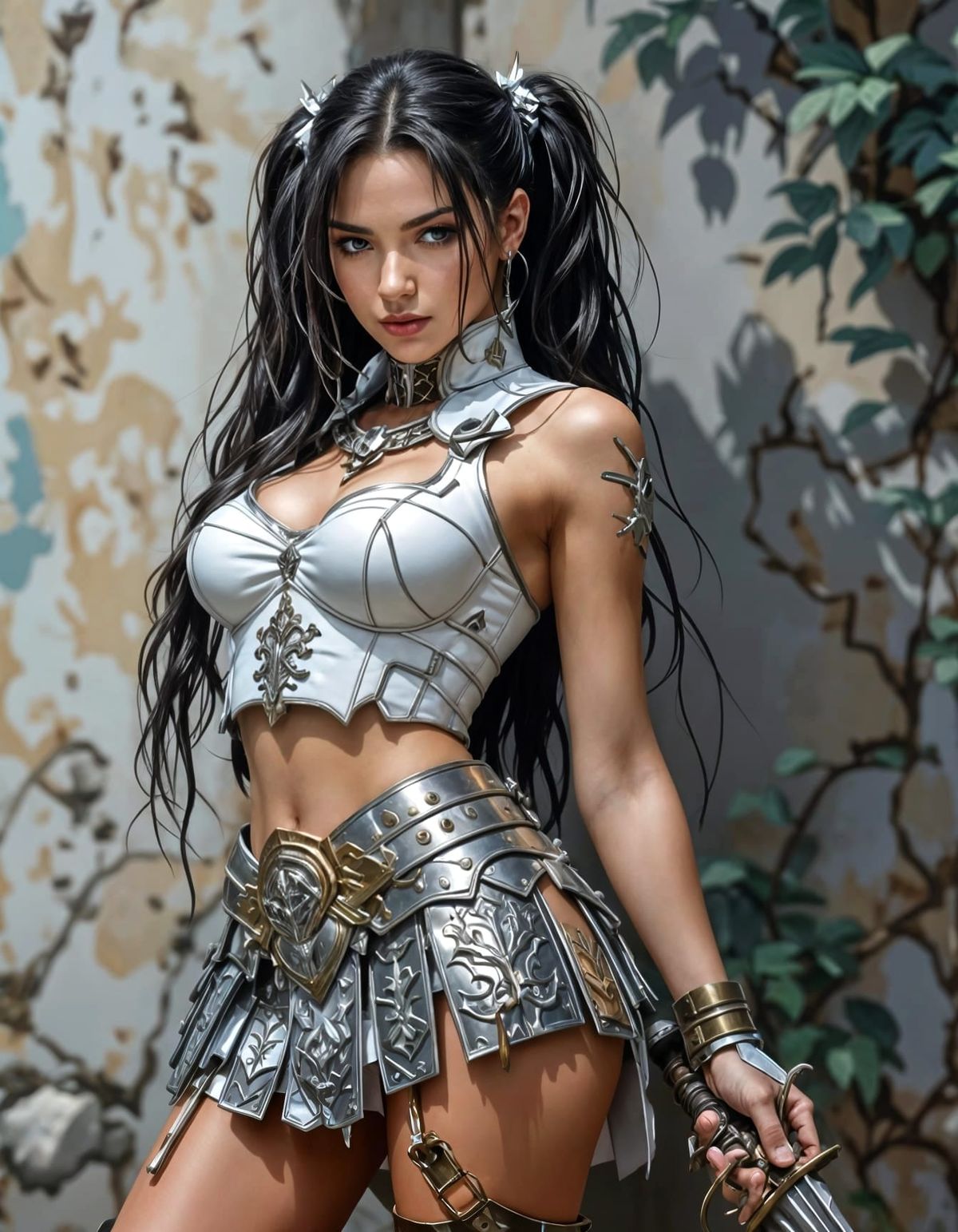 A hyperrealistic concept art piece of a warrior maiden in white leather and silver armor, with intricate details and a vibrant, atmospheric style.
